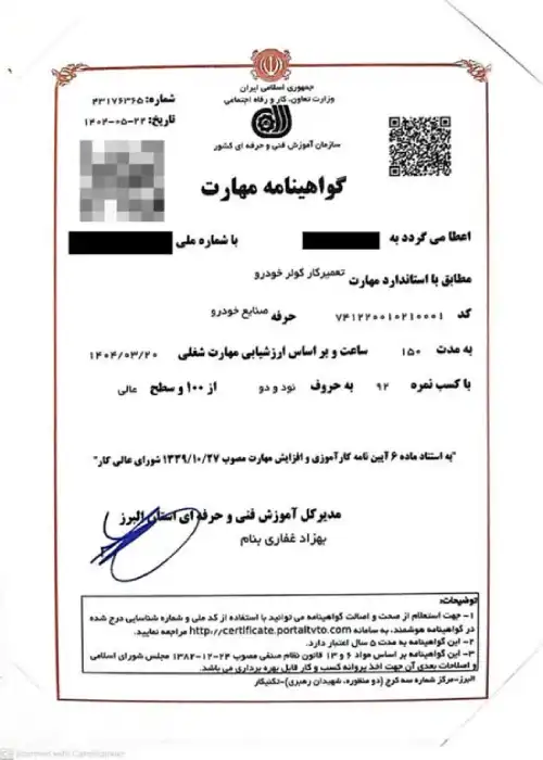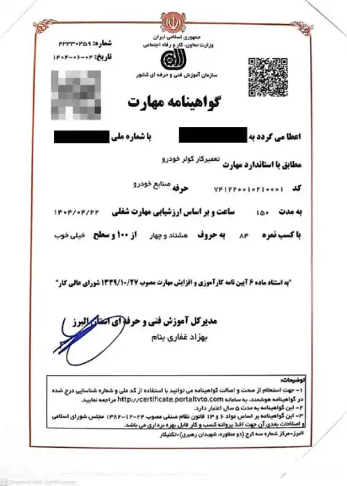 • مدرک فنی حرفه‌ای کولر خودرو در کرج
